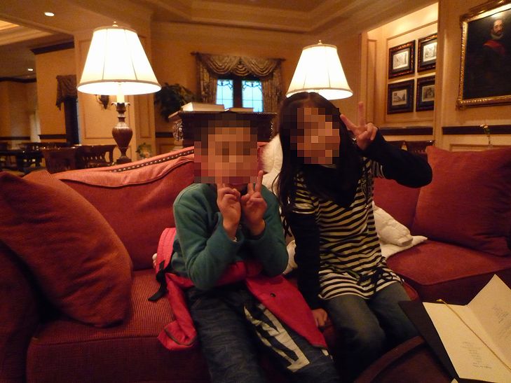 ロビー端の子供用テレビブースに向かおうとする二人に