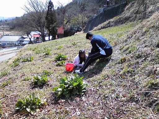 買出しに行く前に ソフトの練習でいない長男を除く4人で ふきのとうを盗りに山へ車を走らせました。 ・・・『採り』じゃなくて『盗り』に・・・ そうです。 今日は ふきのとうを『根っこごと』頂いて 我家の畑に根付かせたいという夫の企みで ふきのとう『盗り』となったのです ここは夫と娘とチビがみつけた 家から10分の山の麓。 天然のふきのとうの群生地です。 慣れた手つきでふきのとうを掘り起こす娘。 さすが野生児・・ 私が呆然としてる間に 3人でこんなにたくさんGET!!